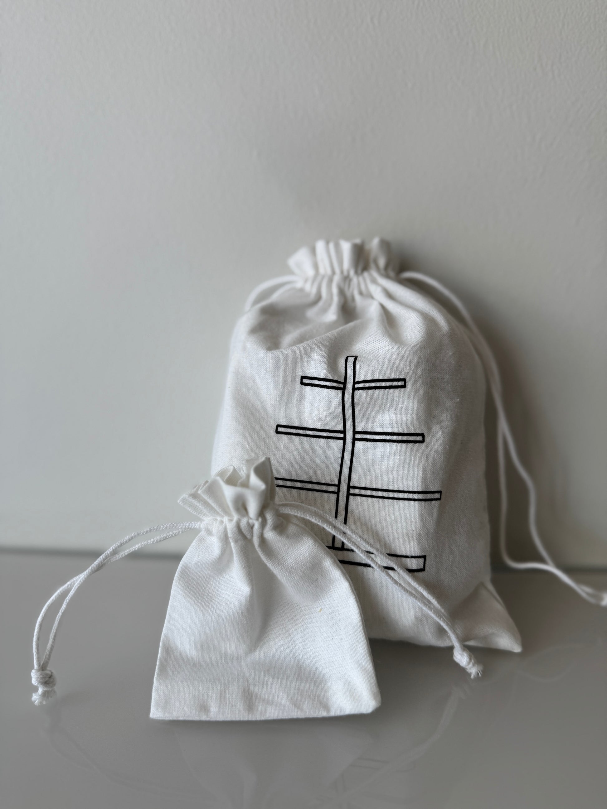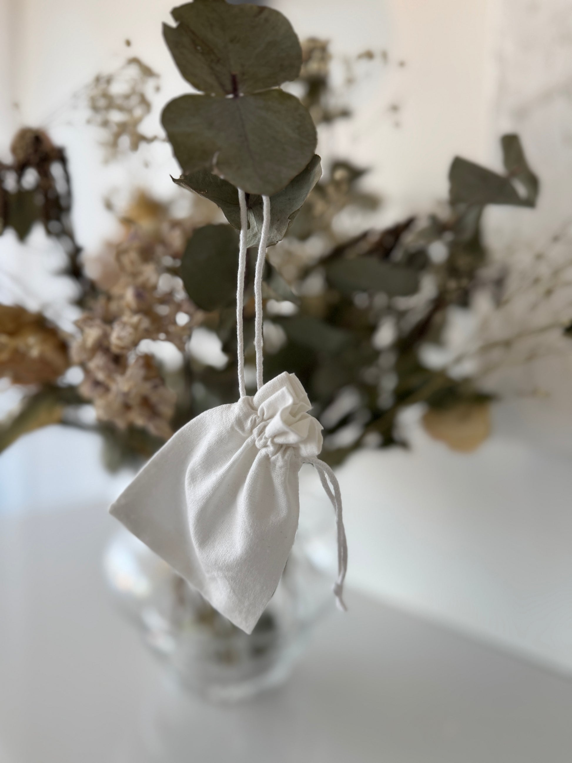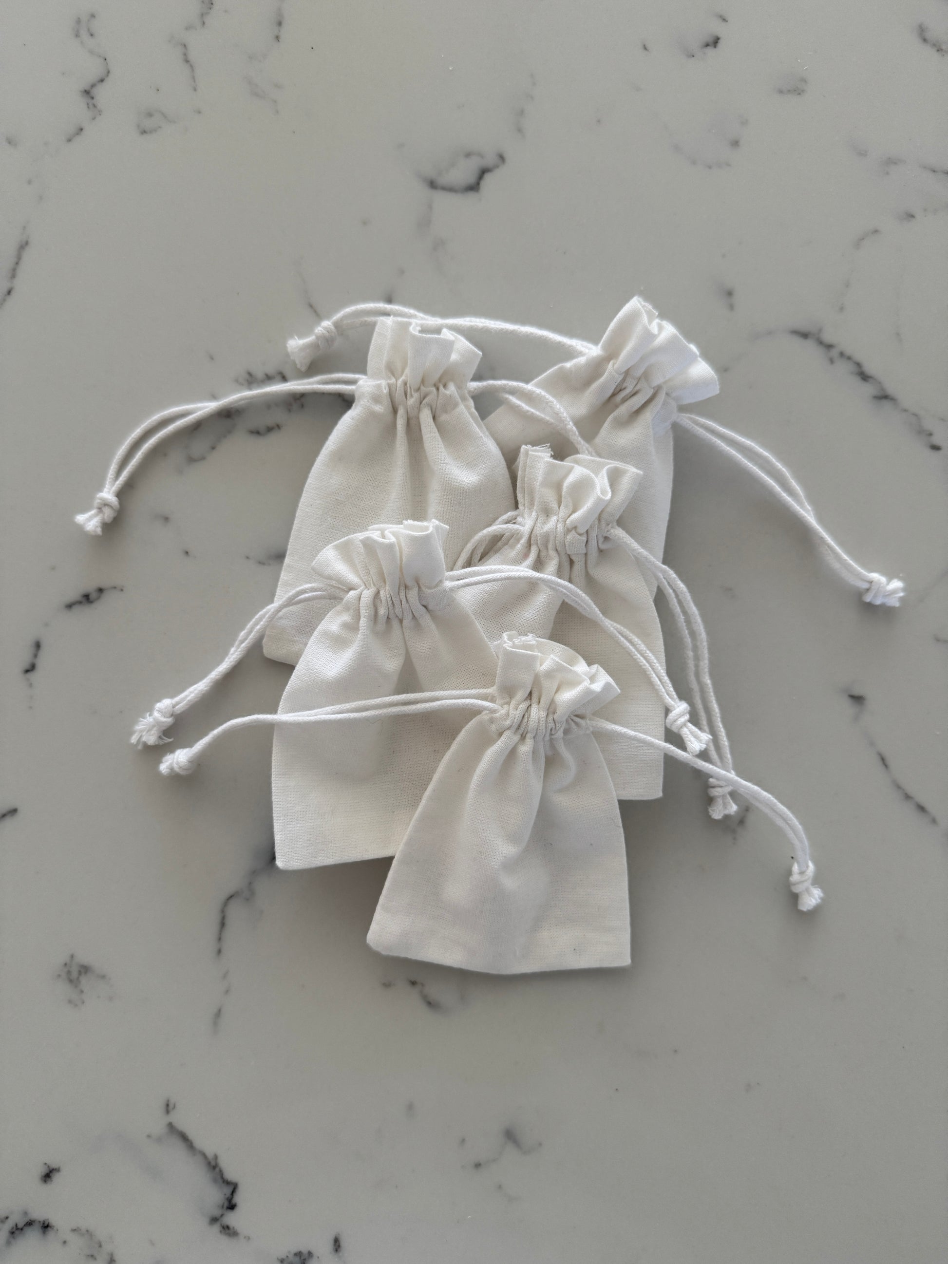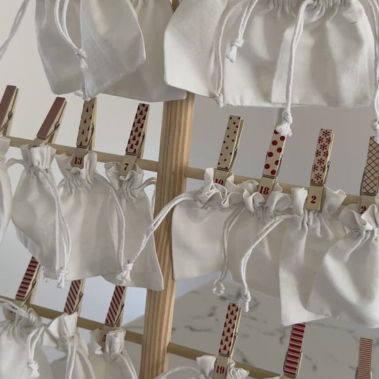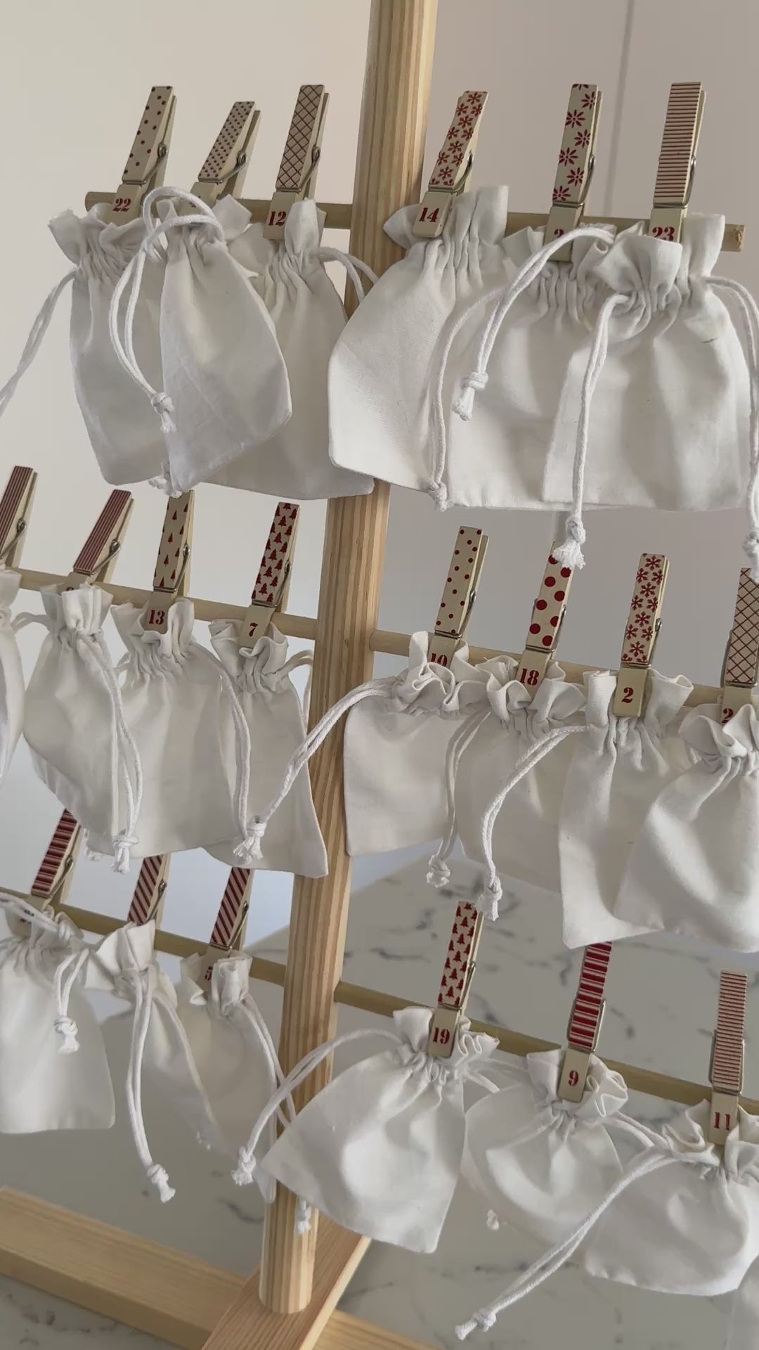 Hvítir bómullarpokar með snúru til að loka fyrir. Tilvalið fyrir smágjafir, sæta mola eða lítla miða með skilaboðum eða samveruhugmyndum fyrir hvern dag í desember.
