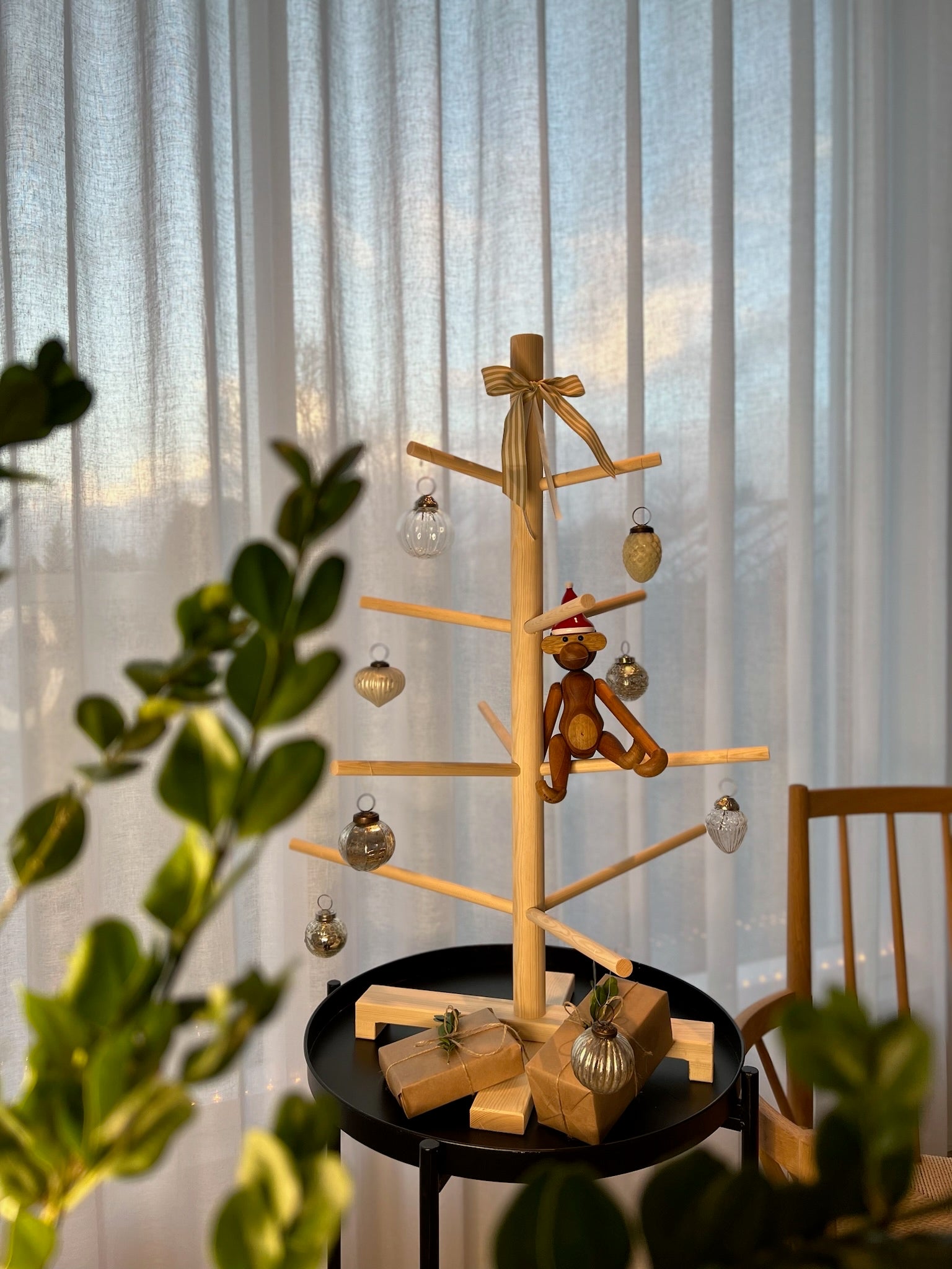 Jólatréð er hannað eins og öll okkar tré, á stöðugum snúningsfæti. Greinarnar raðast á stofninn og má skreyta þær eftir smekk. Fóturinn leggst saman og geymist ásamt öllum greinum trésins í viðarkassa sem fylgir með.