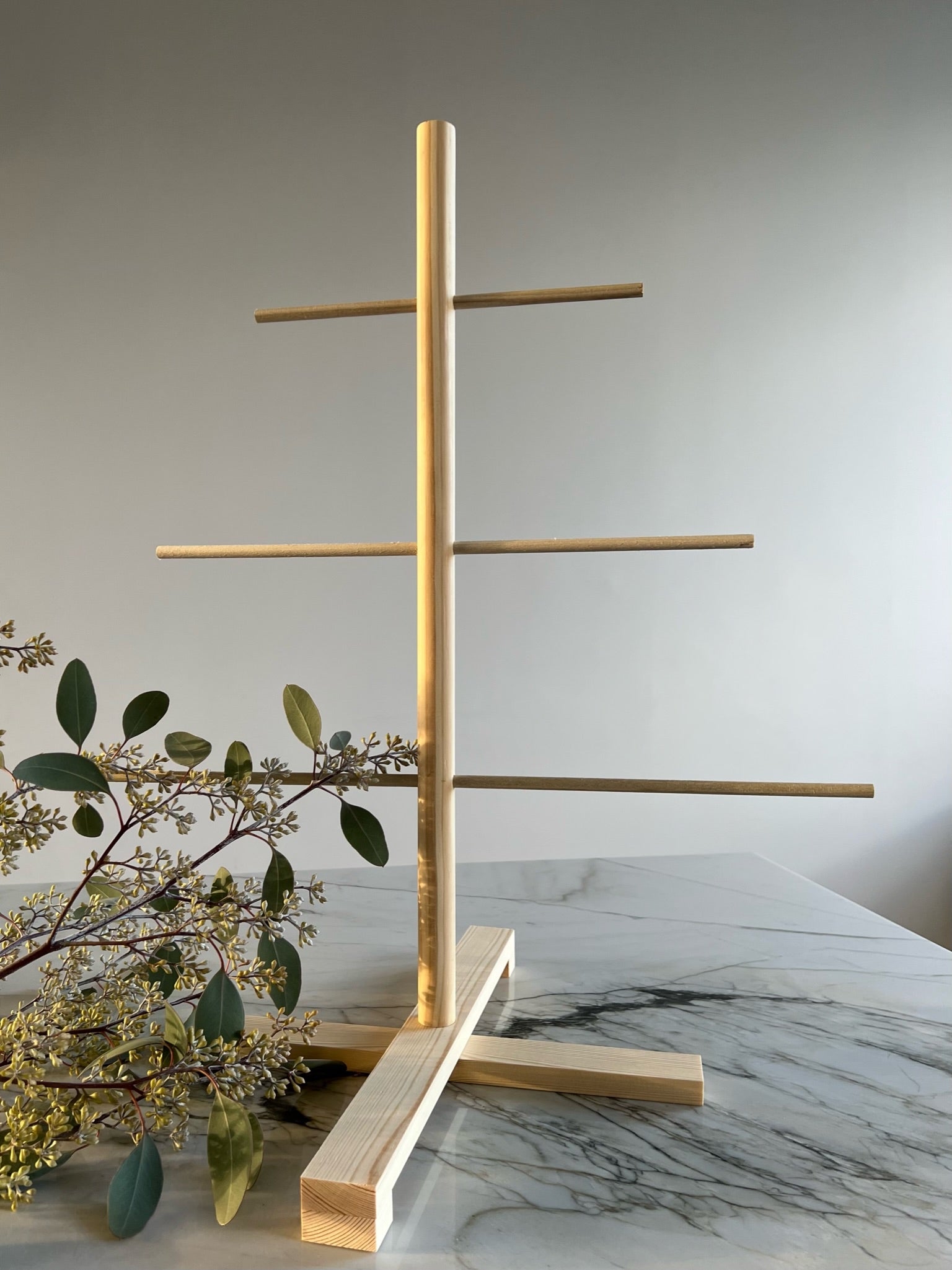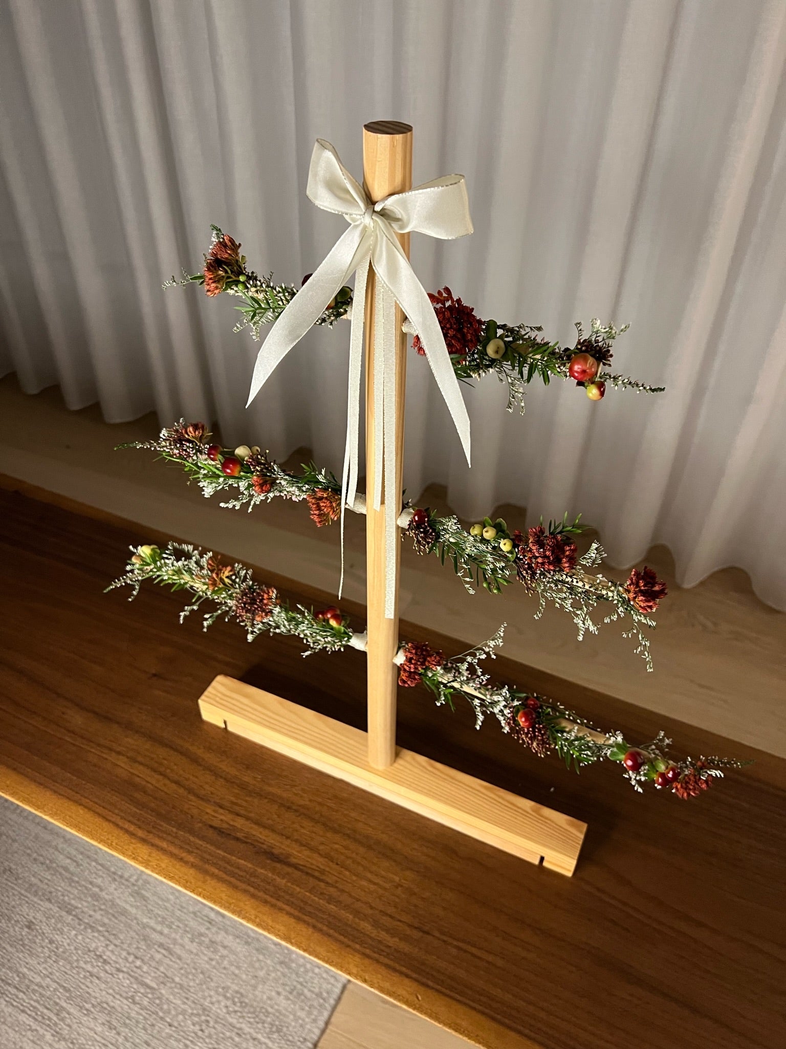 Smátré er á snúningsfæti eins og öll okkar tré, fótinn má opna og stilla eftir hentugleika.